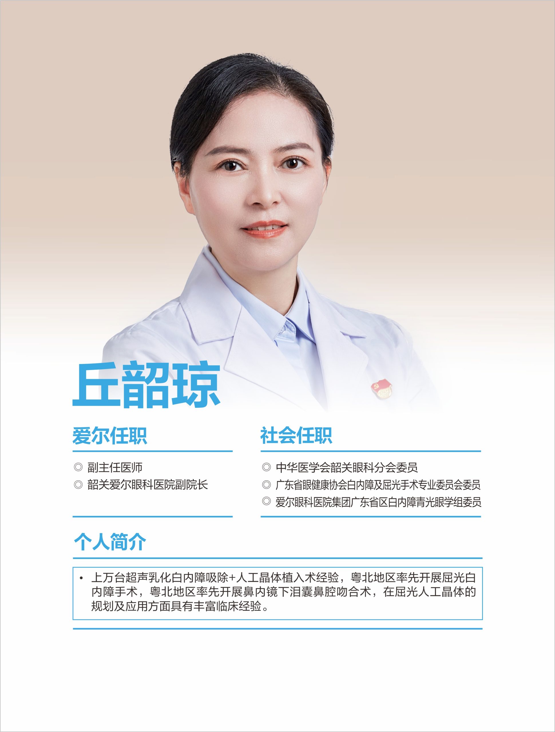 韶關(guān)愛(ài)爾眼科醫(yī)院有限公司白內(nèi)障團(tuán)隊(duì)擁王愛(ài)琴院長(zhǎng)(愛(ài)爾眼科粵北區(qū))、丘韶瓊院長(zhǎng)、郭俊豪主任等多位專(zhuān)科醫(yī)生,具備同步國(guó)際的白內(nèi)障手術(shù)能力,能熟練開(kāi)展各項(xiàng)常規(guī)及疑難白內(nèi)障手術(shù)。 可開(kāi)展微切口煥晶白內(nèi)障手術(shù),植入多焦晶體或多焦+散光矯正晶體,在治療白內(nèi)障同時(shí)同步解決遠(yuǎn)視/近視、老花眼、角膜散光等屈光問(wèn)題,醫(yī)生手術(shù)經(jīng)驗(yàn)豐富,為眾多患者帶來(lái)更舒適的視覺(jué)。